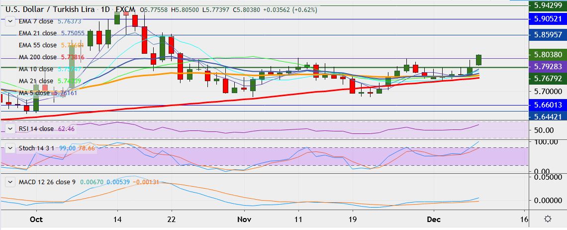 - On the downside, support is seen at 5.7701, and break below could take it near 5.7510 (10-DMA).