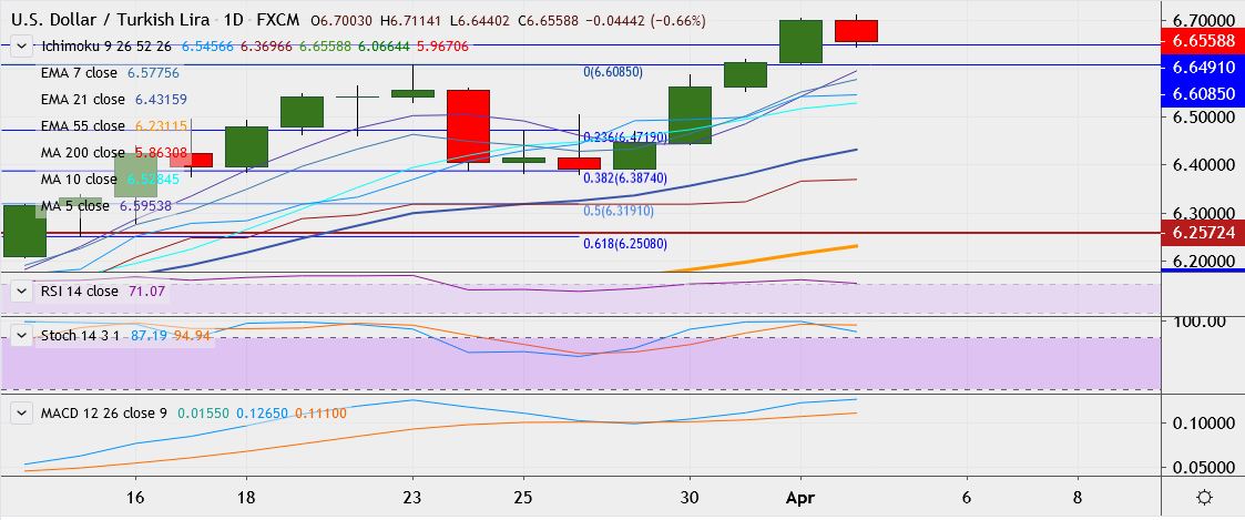 FxWirePro: USD/TRY retreats from 1-1/2 year peak, fails to sustain gains above 6.7000