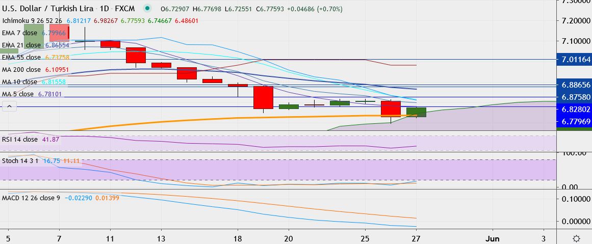 - USD/TRY is trading 0.6 percent higher at 6.7740, having hit a low of 6.6970 the day before, its lowest since April 10.