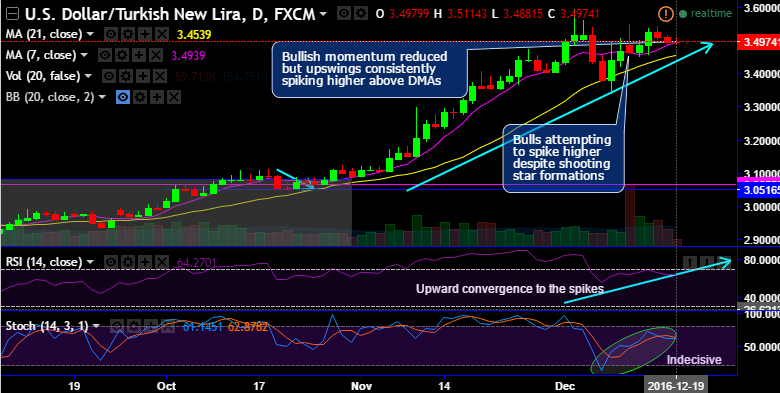 Although the bullish momentum is reduced but upswings consistently spiking higher above DMAs, Bulls attempting to spike higher despite shooting star formations, the Turkish lira weakened sharply in the recent times, with USDTRY surpassing 3.0688 range and then to hit fresh highs of 3.5971 levels.