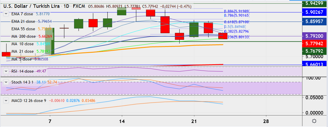 - On the downside, support is seen at 5.7678, and break below could take it near 5.7522 (55-EMA).