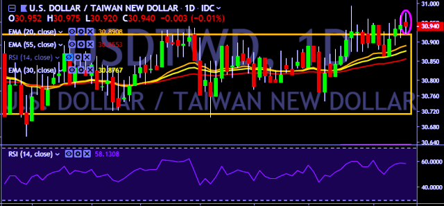 - USD/TWD is currently trading around 30.95 marks.