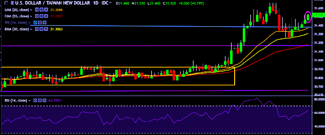 - USD/TWD is currently trading around 31.50 marks.