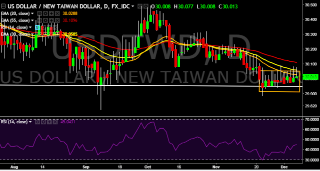 We prefer to take long position on USD/TWD only above 30.10, stop loss 29.88 and target of 30.30/30.50.
