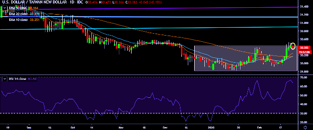 We prefer to take long position on USD/TWD only above 30.50, stop loss at 30.22 and target of 30.70/30.87.