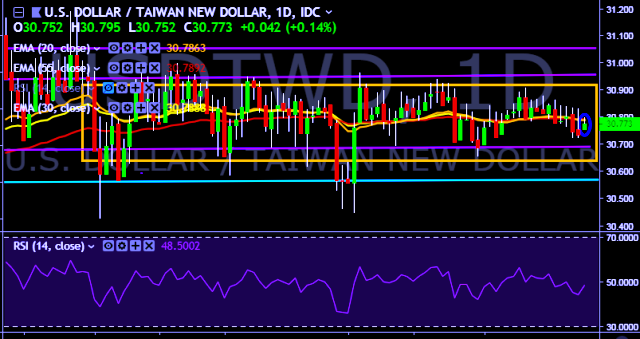 We prefer to take long position on USD/TWD only above 30.90, stop loss at 30.70 and target of 31.18.