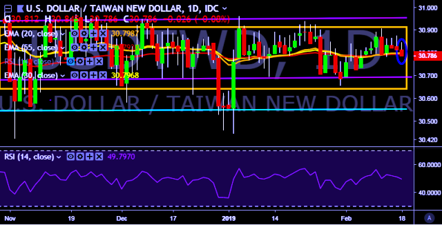 We prefer to take long position on USD/TWD only above 30.90, stop loss at 30.70 and target of 31.18.