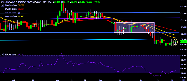 We prefer to take long position on USD/TWD only above 30.70, stop loss 30.20 and target of 31.02/31.22 mark.