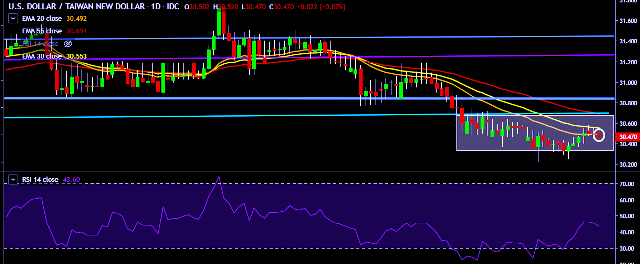 We prefer to take long position on USD/TWD only above 30.58, stop loss at 30.40 and target of 30.87/31.02.