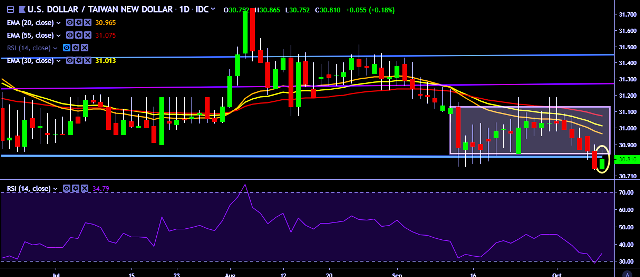 We prefer to take short position on USD/TWD only below 30.75, stop loss 31.02 and target of 30.54/30.38.
