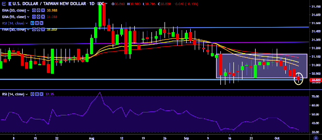 We prefer to take short position on USD/TWD around 30.85, stop loss 31.10 and target of 30.54/30.38.