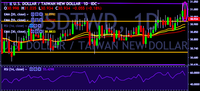 We prefer to take long position on USD/TWD around 30.90, stop loss at 30.68 and target of 31.18/31.28.