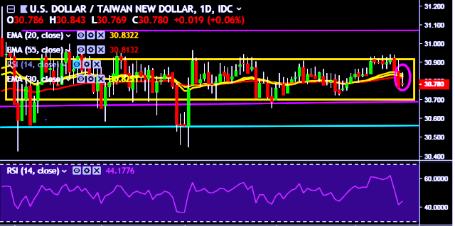 We prefer to take long position on USD/TWD only above 30.92, stop loss at 30.68 and target of 31.18.