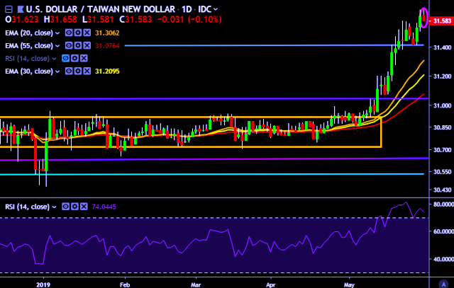 We prefer to take long position on USD/TWD only above 31.65, stop loss at 31.40 and target of 31.90/32.46.