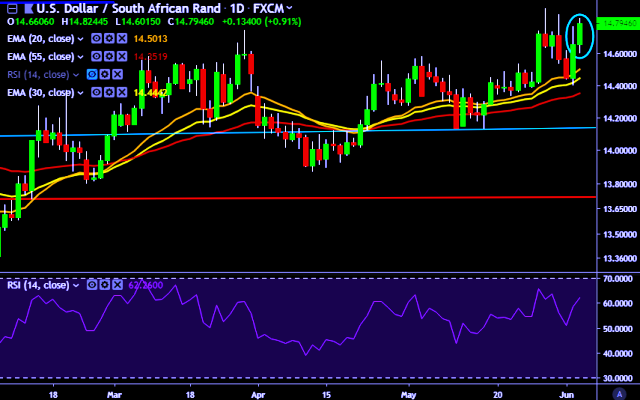 We prefer to take long position on USD/ZAR around 14.72, stop loss at 14.50 and target of 14.94/15.26.