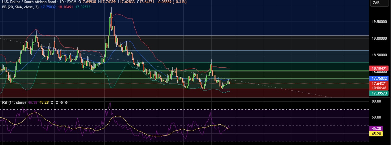 • Strong support is seen at 17.492(23.6%fib) and break below could take the pair towards 17.391(Lower BB)