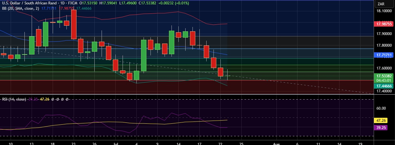 • Strong support is seen at 17.517(50%fib) and break below could take the pair towards 17.408(Lower BB)