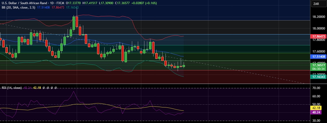 • Strong support is seen at 17.250(23.6%fib) and break below could take the pair towards 17.167(Lower BB)
