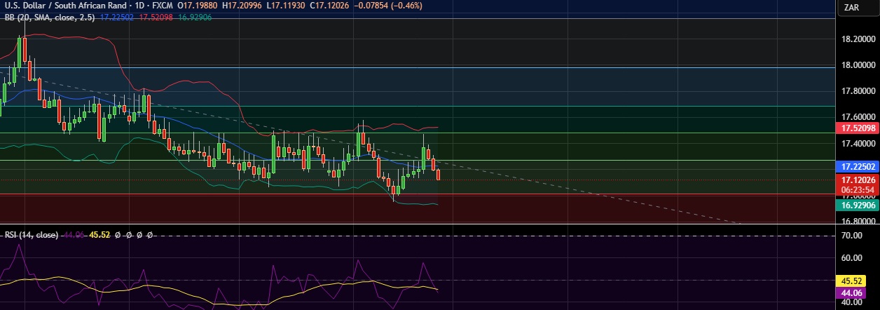 • At GMT 15:31,the dollar was down 0.43% at 17.125 against South African rand .