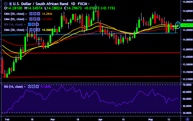 We prefer to take long position on USD/ZAR around 14.27, stop loss at 14.20 and target of 14.40.