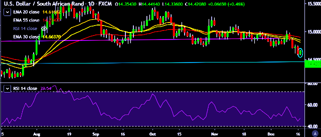 We prefer to take long position on USD/ZAR only above 14.50, stop loss at 14.30 and target of 14.70/14.94/15.02.