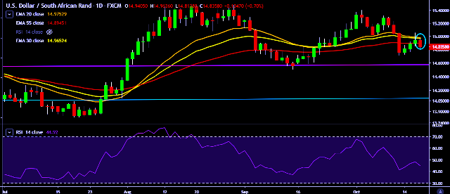 We prefer to take short position on USD/ZAR around 14.85, stop loss at 15.02 and target of 14.55.