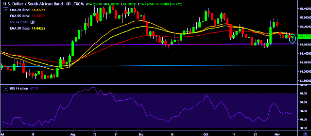 We prefer to take long position on USD/ZAR only above 14.94, stop loss at 14.67 and target of 15.02/15.22.