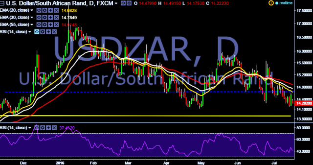 We prefer to take short position in USD/ZAR around 14.35, stop loss 14.62 and target 14.17/ 13.68 marks.