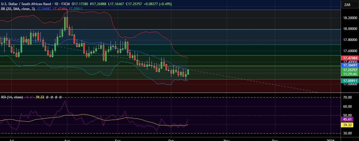 • At GMT 09:26,the dollar was up 0.10% at 17.257 against South African Rand .
