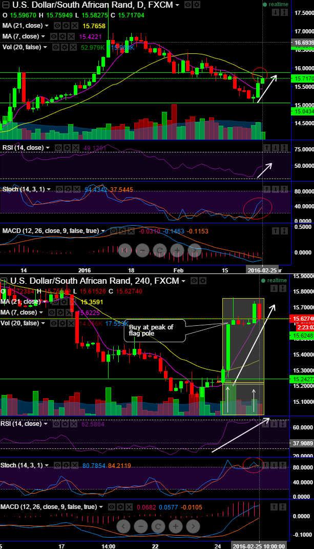 We've received the confirmation on next candle with big real body at 15.7238 levels resembling flag pole again.