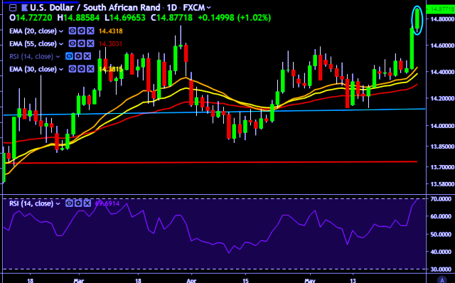 - USD/ZAR is currently trading around 14.86 levels.