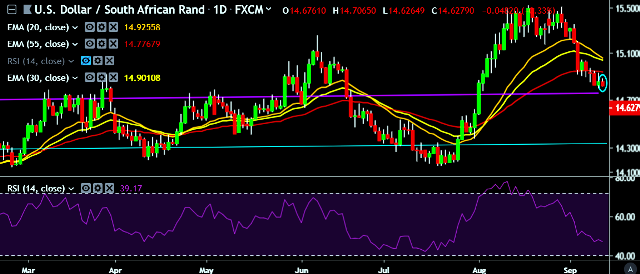 We prefer to take short position on USD/ZAR around 14.65, stop loss at 14.80 and target of 14.22//14.05.