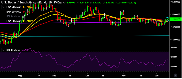 We prefer to take long position on USD/ZAR around 14.80, stop loss at 14.70 and target of 14.94/15.02.