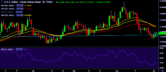 We prefer to take short position on USD/ZAR around 14.20, stop loss at 14.32 and target of 14.02/13.78.