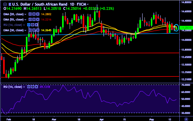 We prefer to take short position on USD/ZAR around 14.25, stop loss at 14.40 and target of 14.02.