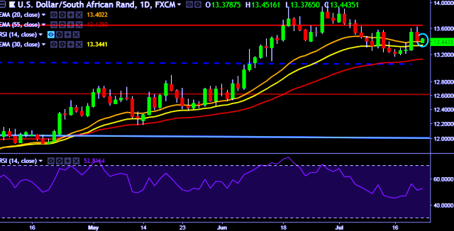 We prefer to take long position on USD/ZAR around 13.42, stop loss 13.35 and target of 13.52/13.70/13.94.