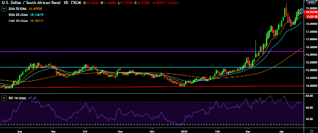 We prefer to take long position on USD/ZAR only above 19.00, stop loss at 18.64 and target of 19.54.