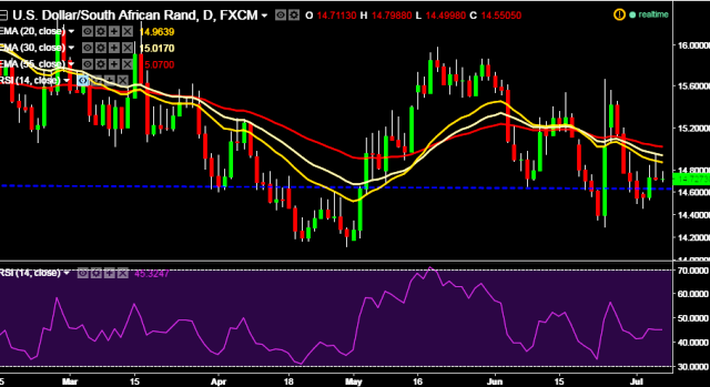 We prefer to take short position on USD/ZAR only below 14.70 with stop loss at 14.96 and target 14.53/ 14.28 marks respectively.
