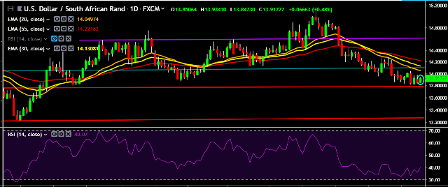 We prefer to take short position on USD/ZAR around 13.96, stop loss at 14.05 and target of 13.80/13.70/13.40.