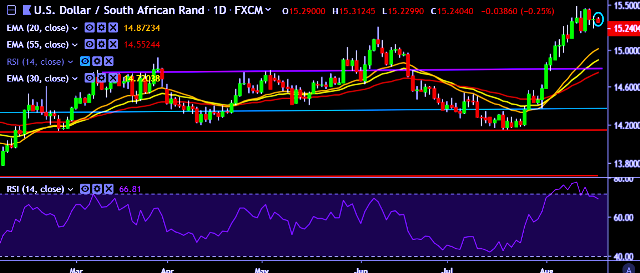 We prefer to take long position on USD/ZAR only above 15.32, stop loss at 15.08 and target of 15.87.