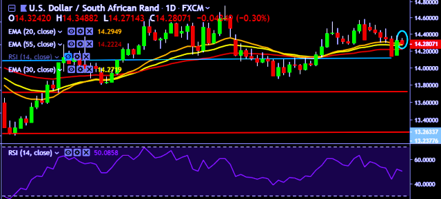 We prefer to take long position on USD/ZAR only above 14.40, stop loss at 14.22 and target of 14.75/14.94.