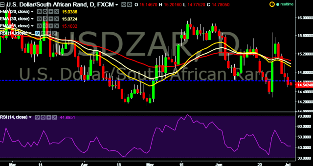 We prefer to take short position on USD/ZAR around 14.60 with stop loss at 14.96 and target 14.19 marks.