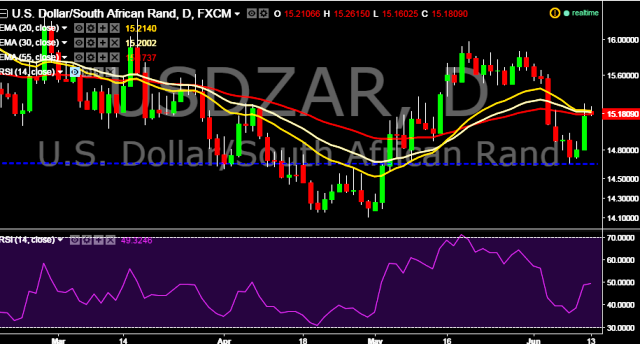 We prefer to take long position in USD/ZAR only above 15.29, stop loss 14.98 and target 15.61 marks.