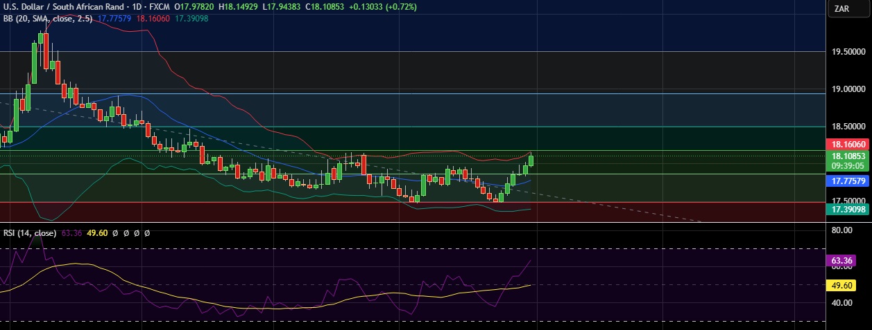 • At 17:57 GMT, the dollar was trading at 17.936 up 0.45% against the South African rand.,
