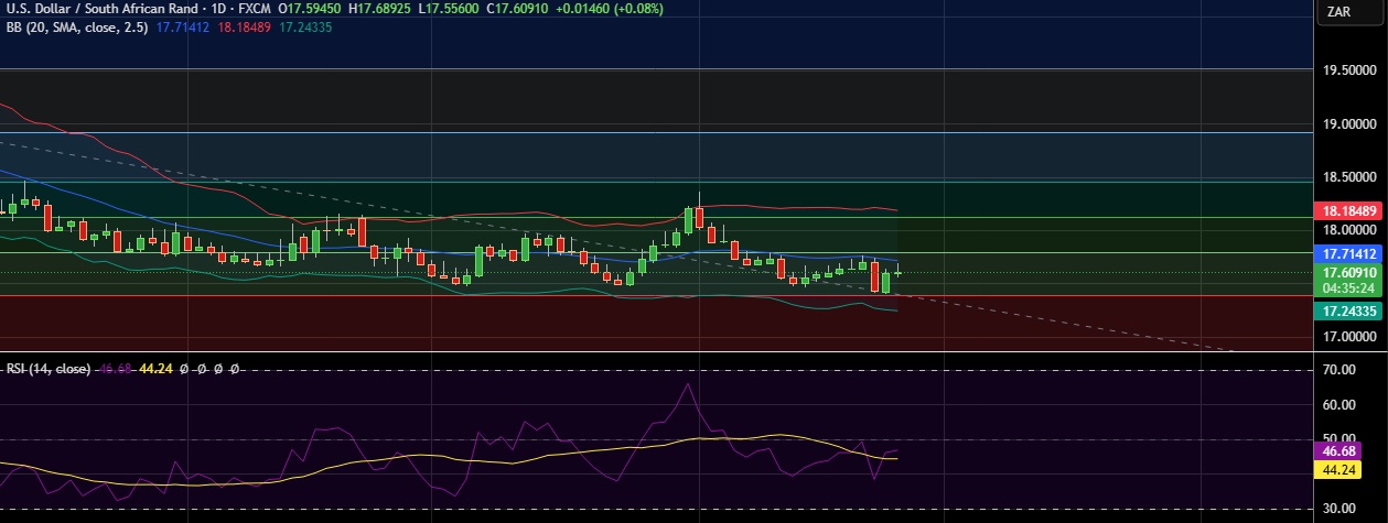 • Strong support is seen at 17.390(23.6%fib) and break below could take the pair towards 17.246(Lower BB)