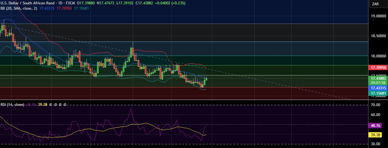 • Strong support is seen at 17.224(23.6%fib) and break below could take the pair towards 17.154(Lower BB)