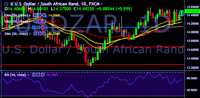We prefer to take long position on USD/ZAR around 14.45, stop loss at 14.35 and target of 14.64.