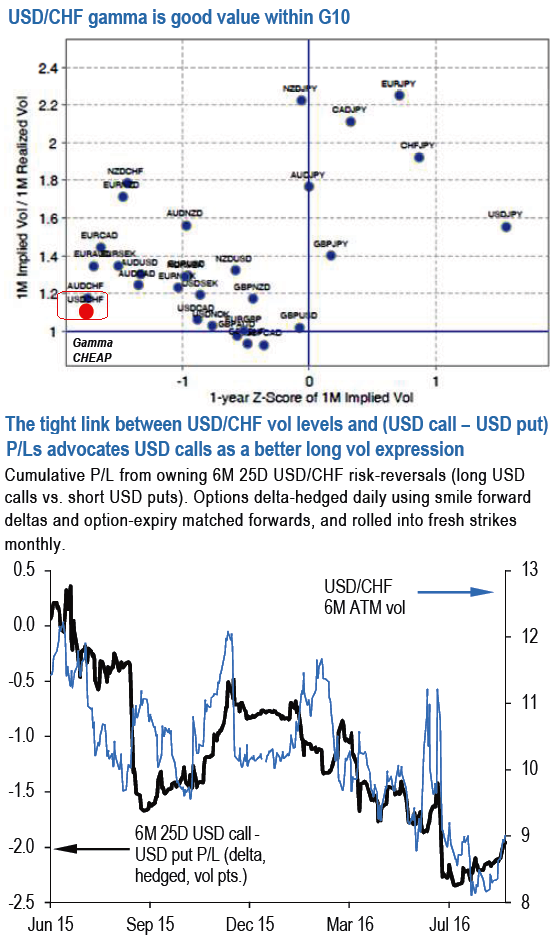 CHF is a good vol to own within G10 on gamma grounds alone (see above chart). Receptively, high-frequency realized vols have arrested their post-Brexit negative momentum and begun to turn mildly higher in August even in a broadly risk-friendly market lacking in macro catalysts.