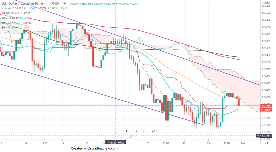 USDCAD is trading flat despite better than expected Canadian GDP. It came at 4.5% for May compared to a forecast of 3.5%. The US data came mixed with Personal spending grows by 5.6% and income declined by 1.1%. The Chicago PMI in July rose to 51.9 vs estimate of 44.0. It hits an intraday high of 1.34360 and is currently trading around 1.342340.