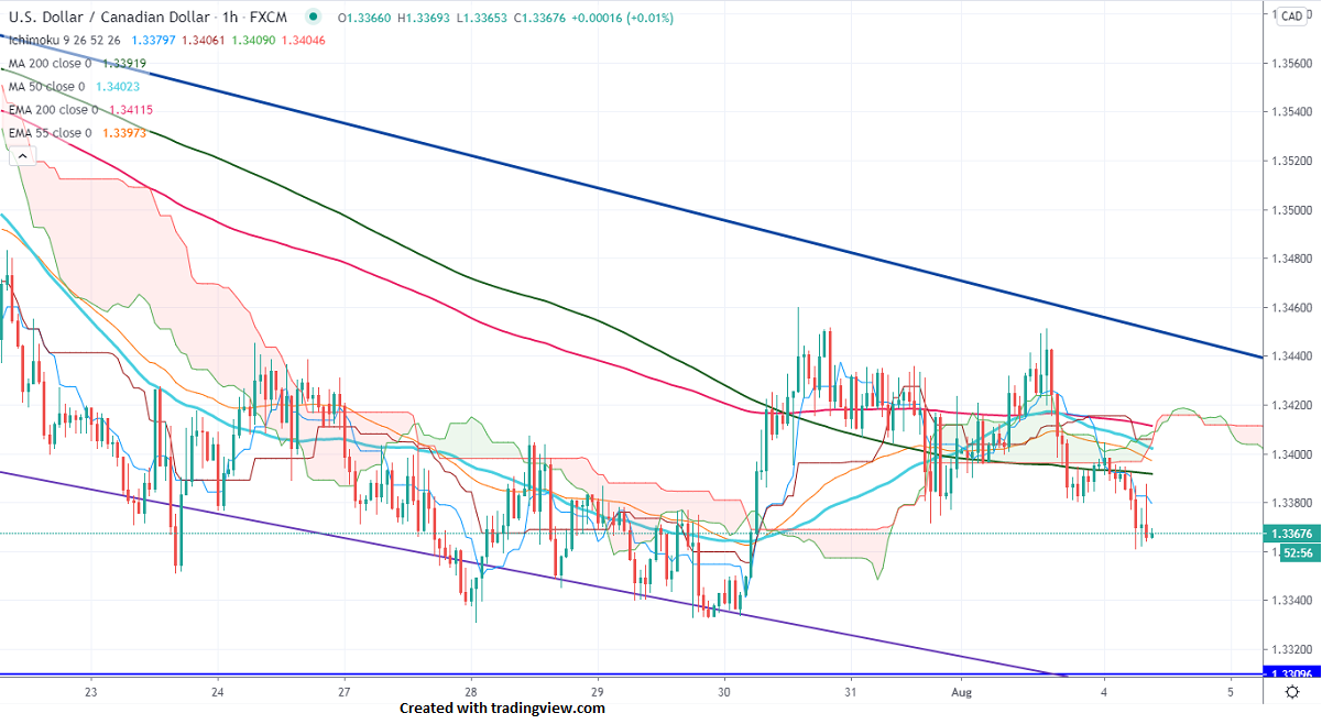 USDCAD is trading in a narrow range between 1.3333 and 1.34511 for the past one month. The Canadian dollar is gaining against for the fourth consecutive month. The positive Canada economic data and surging crude oil is a major reason for bullishness. The US ISM manufacturing index came at 54.2% in Jul compared to a forecast of 53.6. Markets US and Canadian jobs data on Friday for further direction. It hits an intraday low of 1.33610 and currently trading around 1.33658.